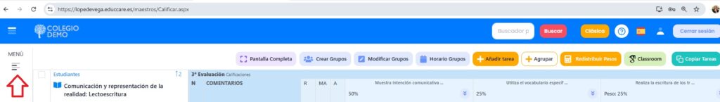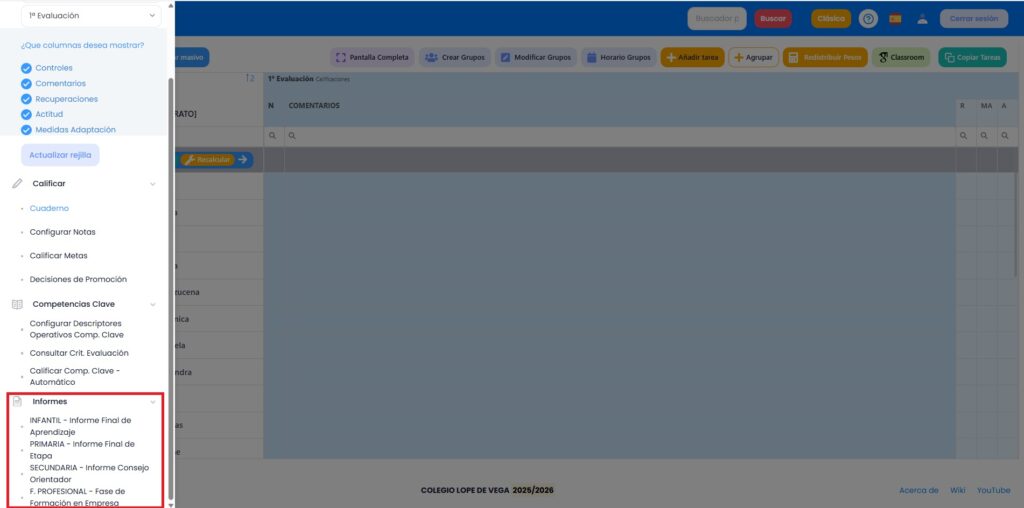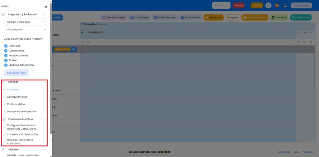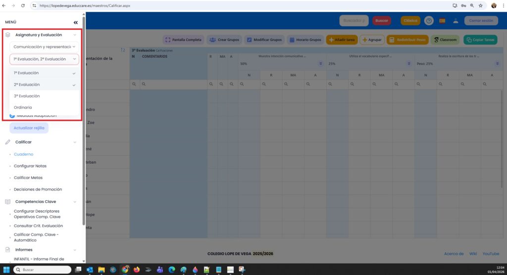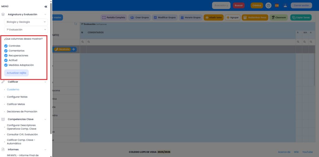 Desde esta opción podemos calificar la nota final de una evaluación y además llevar el control del cuaderno del profesor, a través de tareas/columnas creadas en cada evaluación en función de los filtros que activemos en el menú de la izquierda