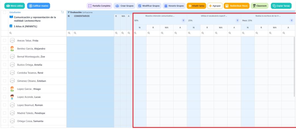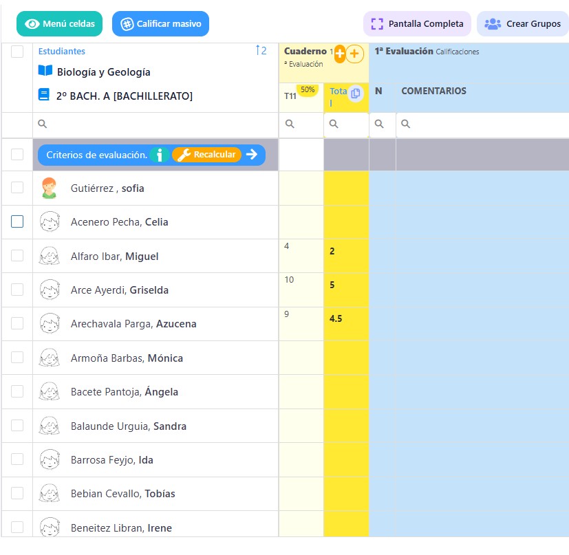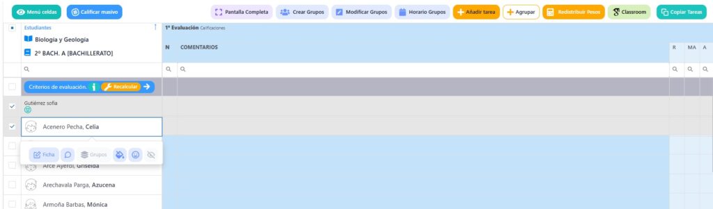 Tendréis que seleccionar a los alumnos sobre los que vayáis a evaluar de forma masiva antes de seleccionar “Calificar masivo”
