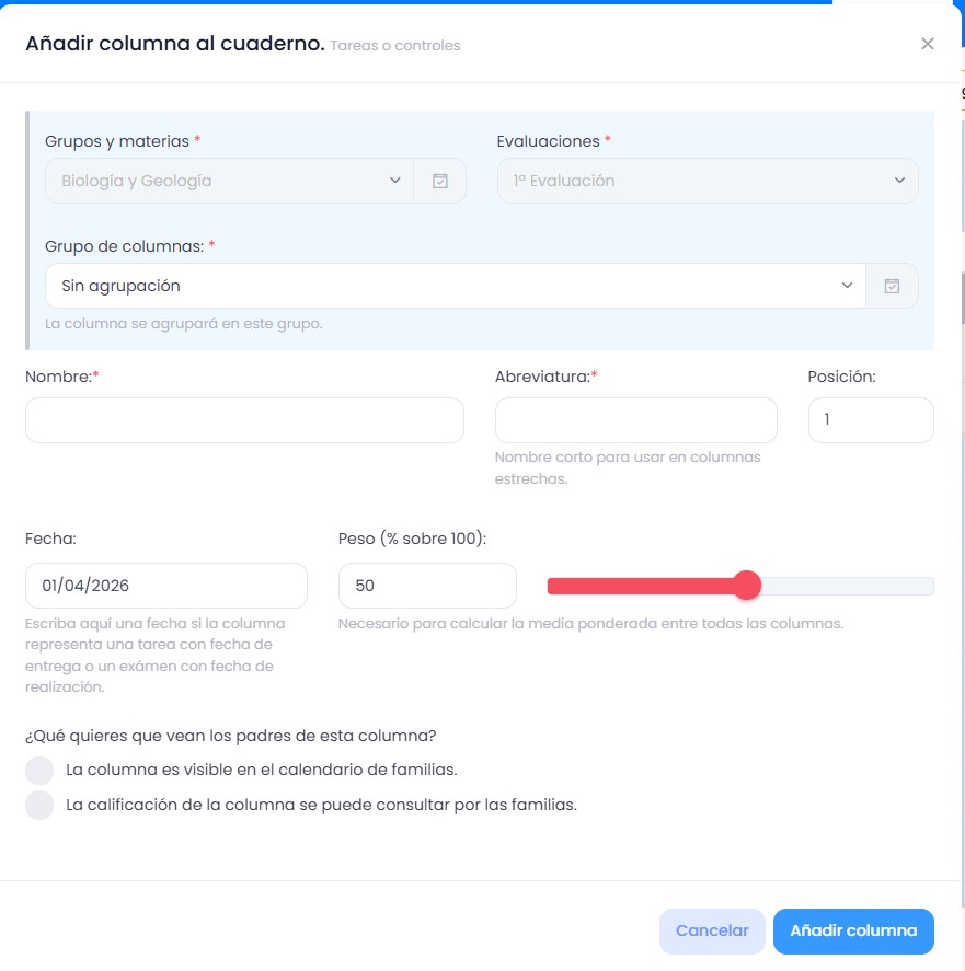 Se nos abrirá una ficha en la que podemos elegir la materia, evaluación, fecha, peso sobre la nota final, un color, y si queremos que se publique en el portal de familias, tanto la tarea como la nota de la misma.