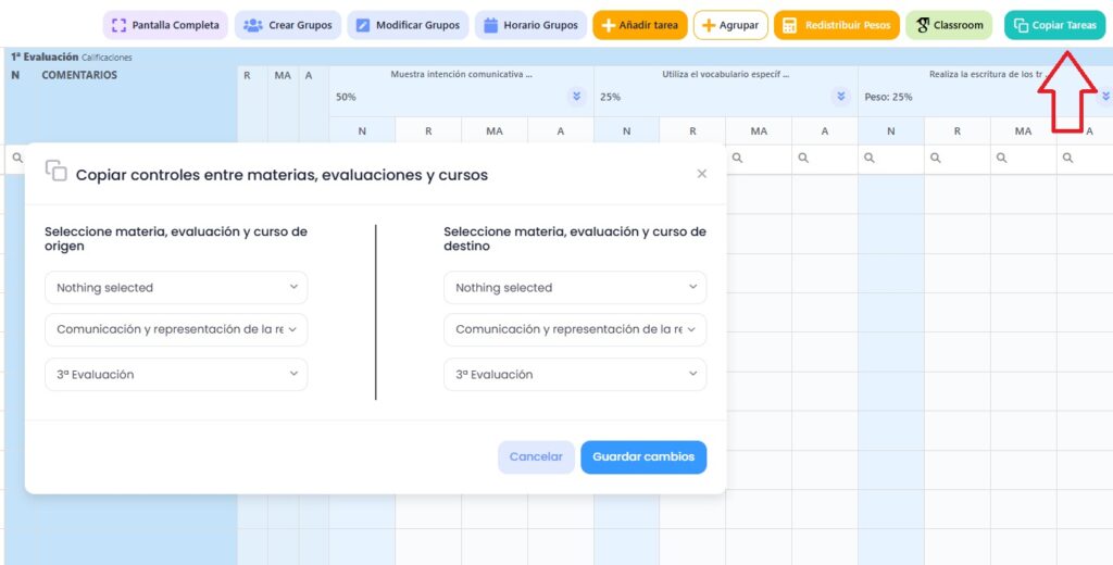 Con el botón Copiar Tareas, vais a poder copiar las tareas de una evaluación o curso