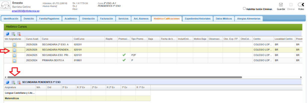 De esta manera ya le hemos matriculado en el curso de pendientes, ahora entraríamos en la línea nueva que hemos dado de alta y añadimos la o las asignaturas en las que haya que matricularle.