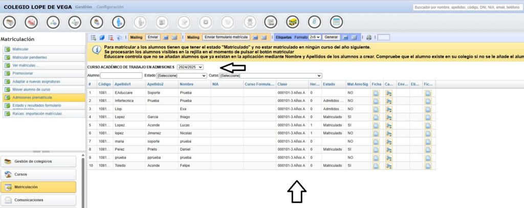 En el escritorio aparecerá una pantalla donde debemos elegir el curso académico, anterior al cual vamos a matricular a los alumnos, y nos aparecerán todos los alumnos que hemos registrado, los cuales pidieron información o solicitaron matricularse en el año siguiente al que hemos elegido en admisiones.