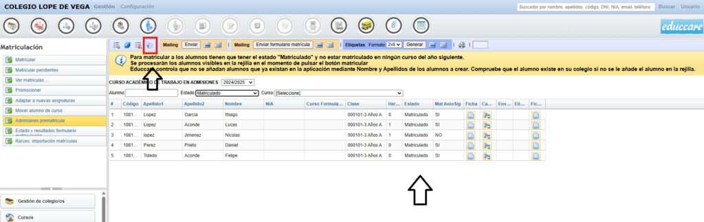 Sólo se matricularán los alumnos que estén visibles en la rejilla, esto es, si hemos cambiado estado a MATRICULADO a un alumno y luego hemos puesto un filtro, por ejemplo por curso, y ese alumno no sale pues no sigue los criterios del filtro, NO se va a matricular aunque tenga estado MATRICULADO.