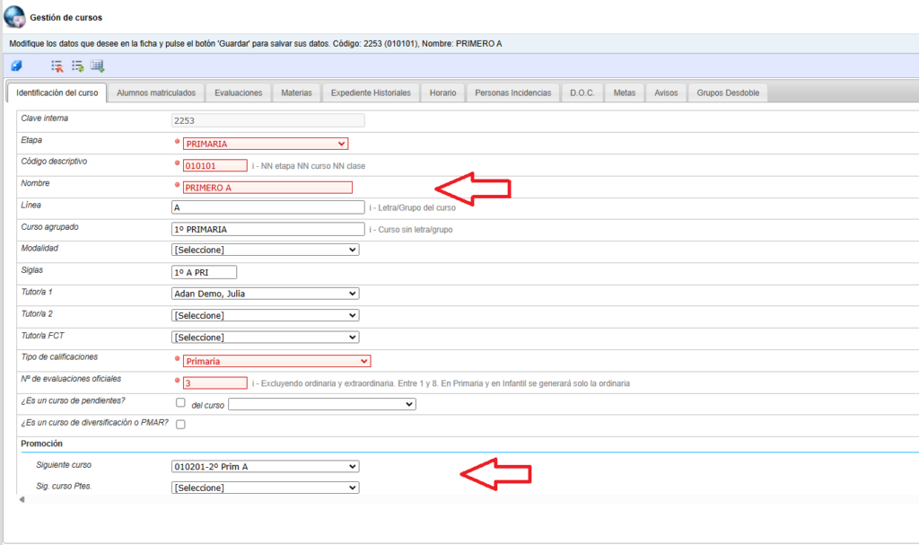 Nos mostrará una pantalla con todos los cursos que tengan seleccionado “SIGUIENTE CURSO” en el apartado de PROMOCIÓN de la configuración de la ficha del curso.